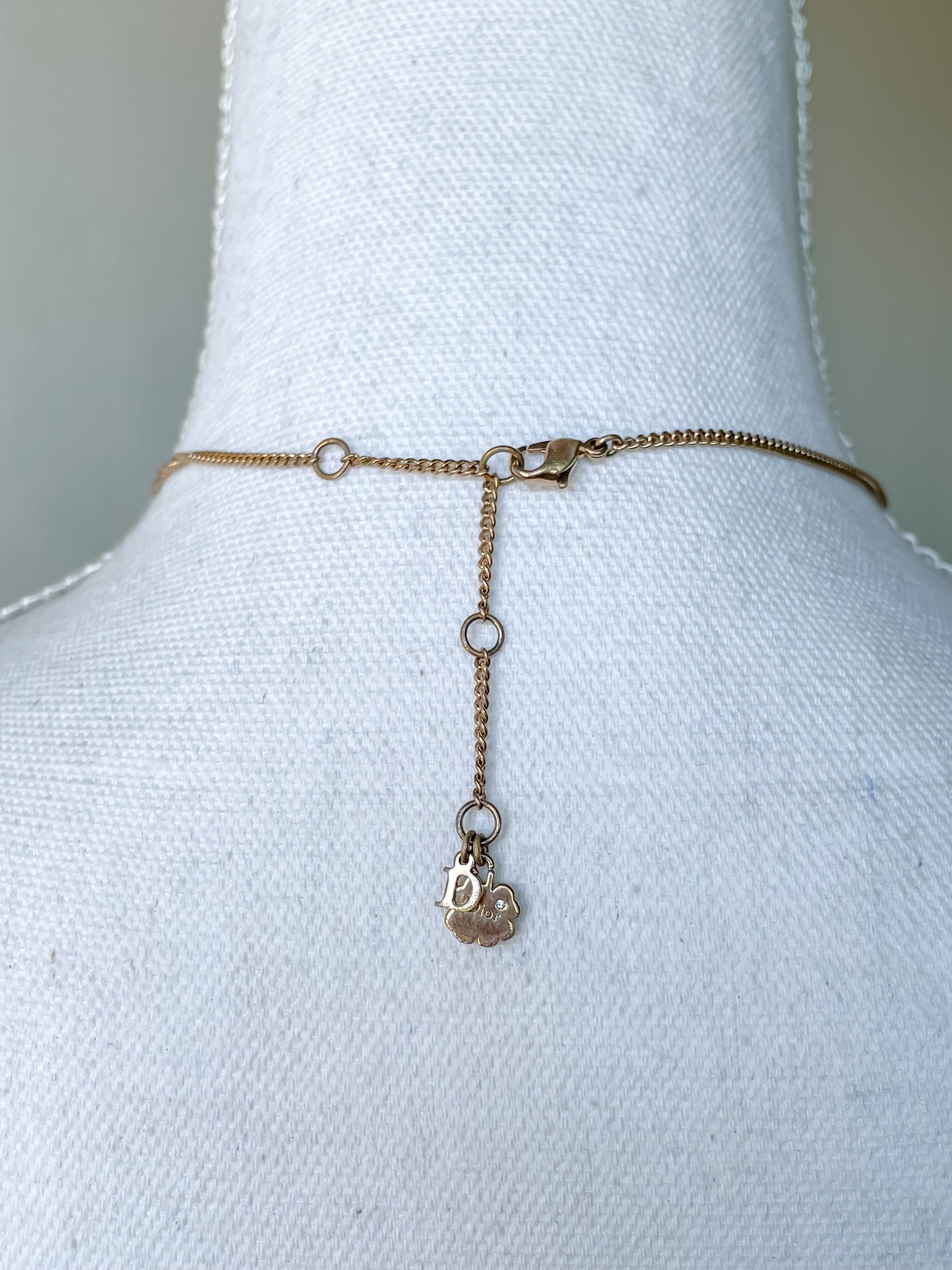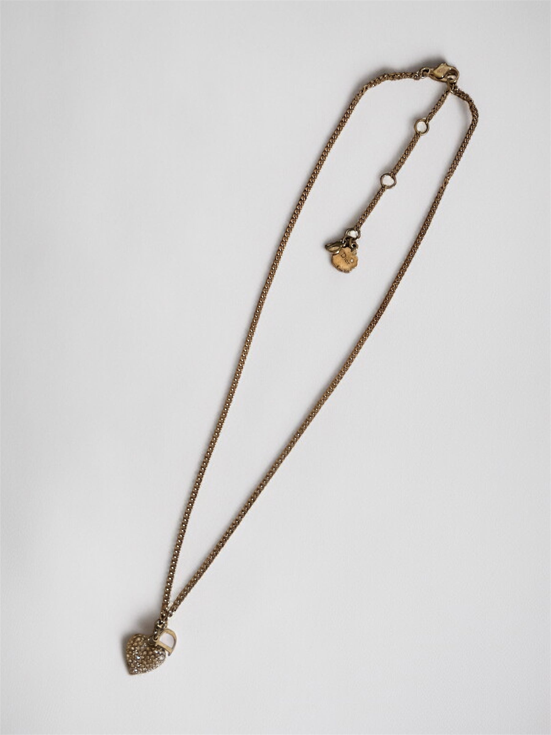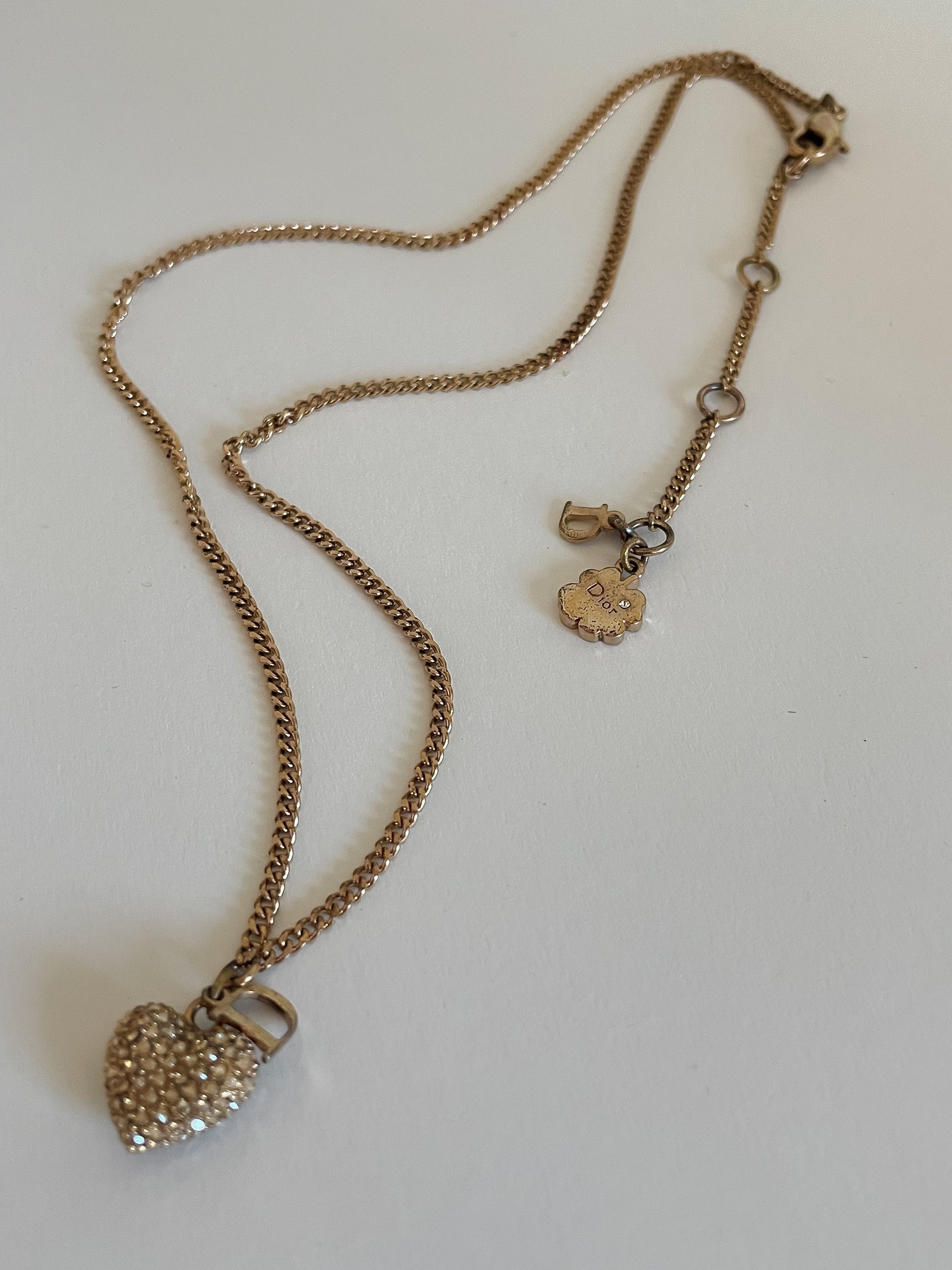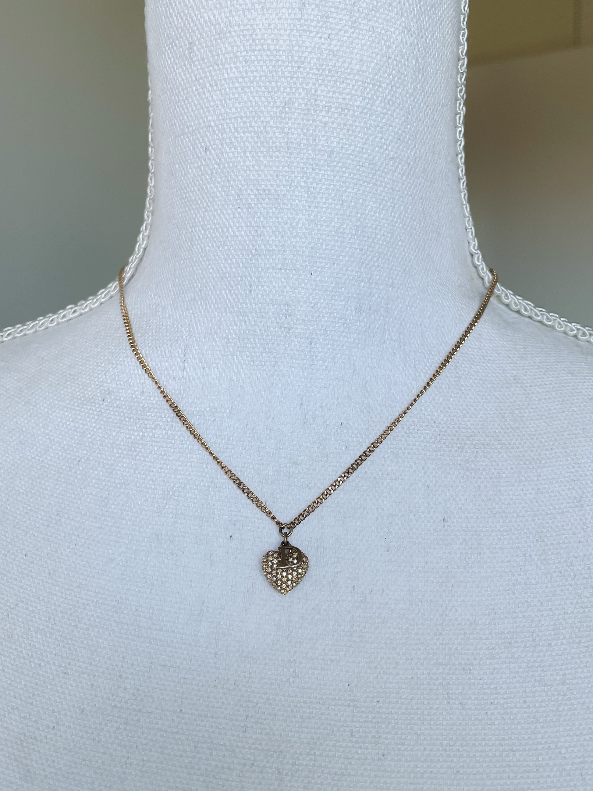 Vintage Dior Gold Necklace – D Initial Charm with Rhinestone Heart Pendant